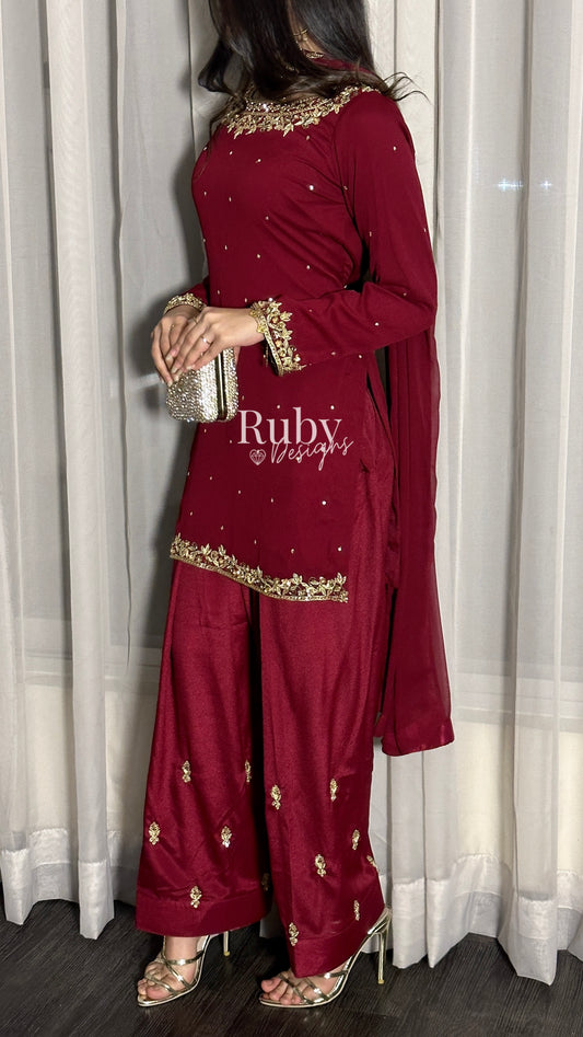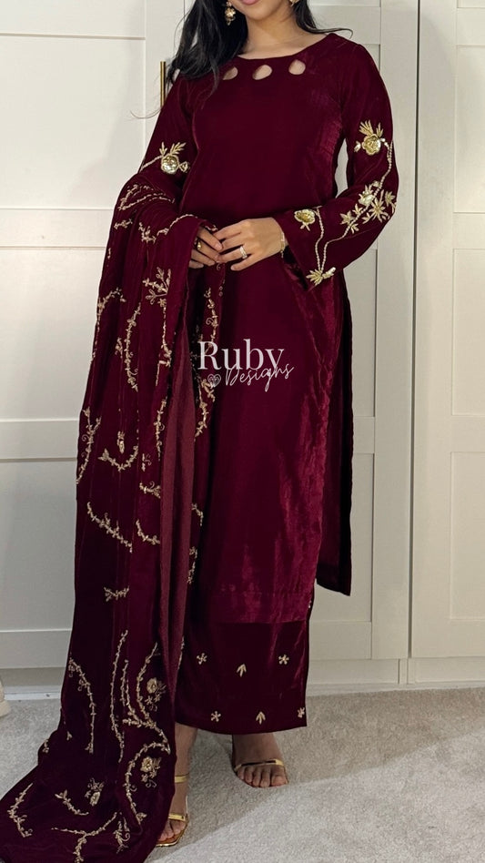 ANUM - 3 Piece Maroon Luxury Velvet Suit with Pearls
