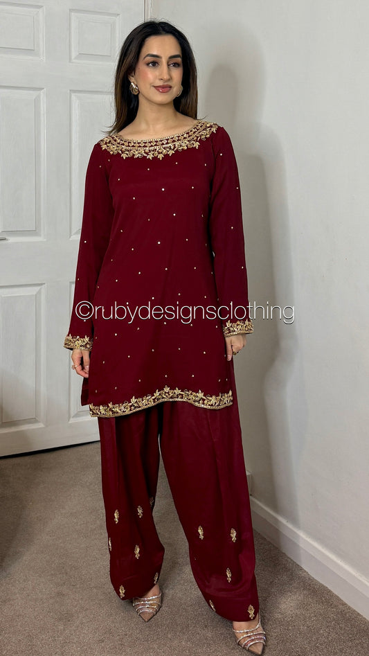 HUMNA Ruby - 3 Piece Chiffon Suit with Farshi Shalwar