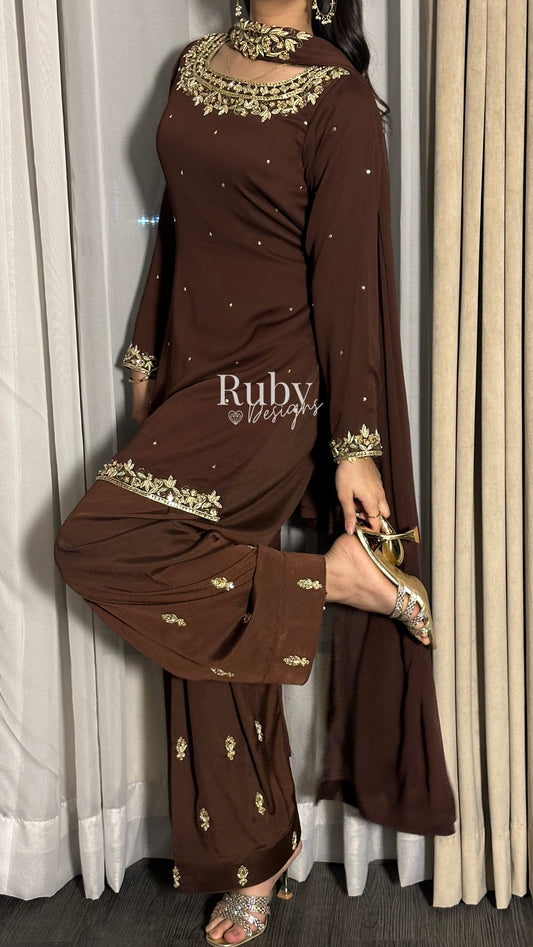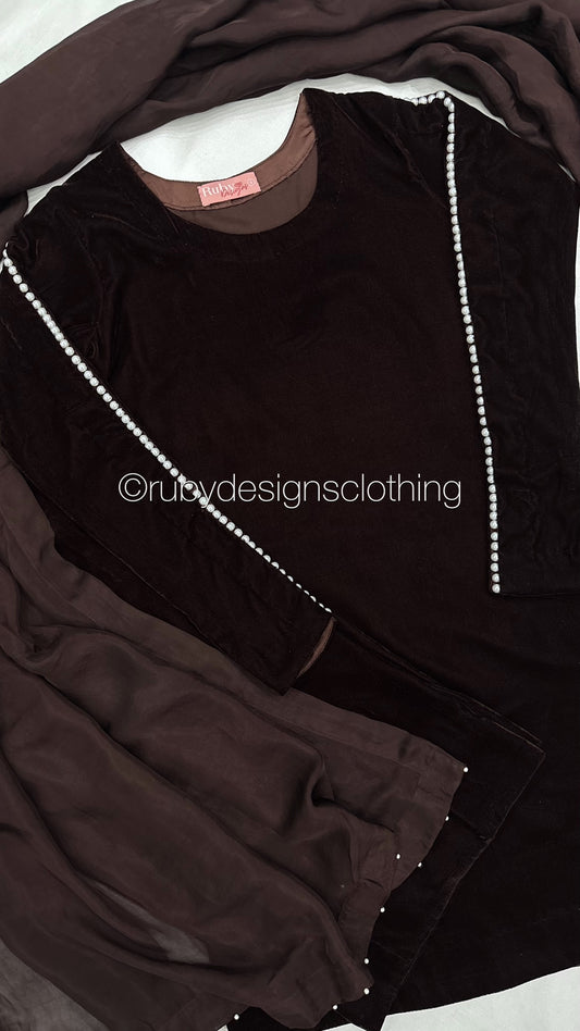 ADILA - 3 Piece Deep Brown Luxury Velvet Suit with Pearls