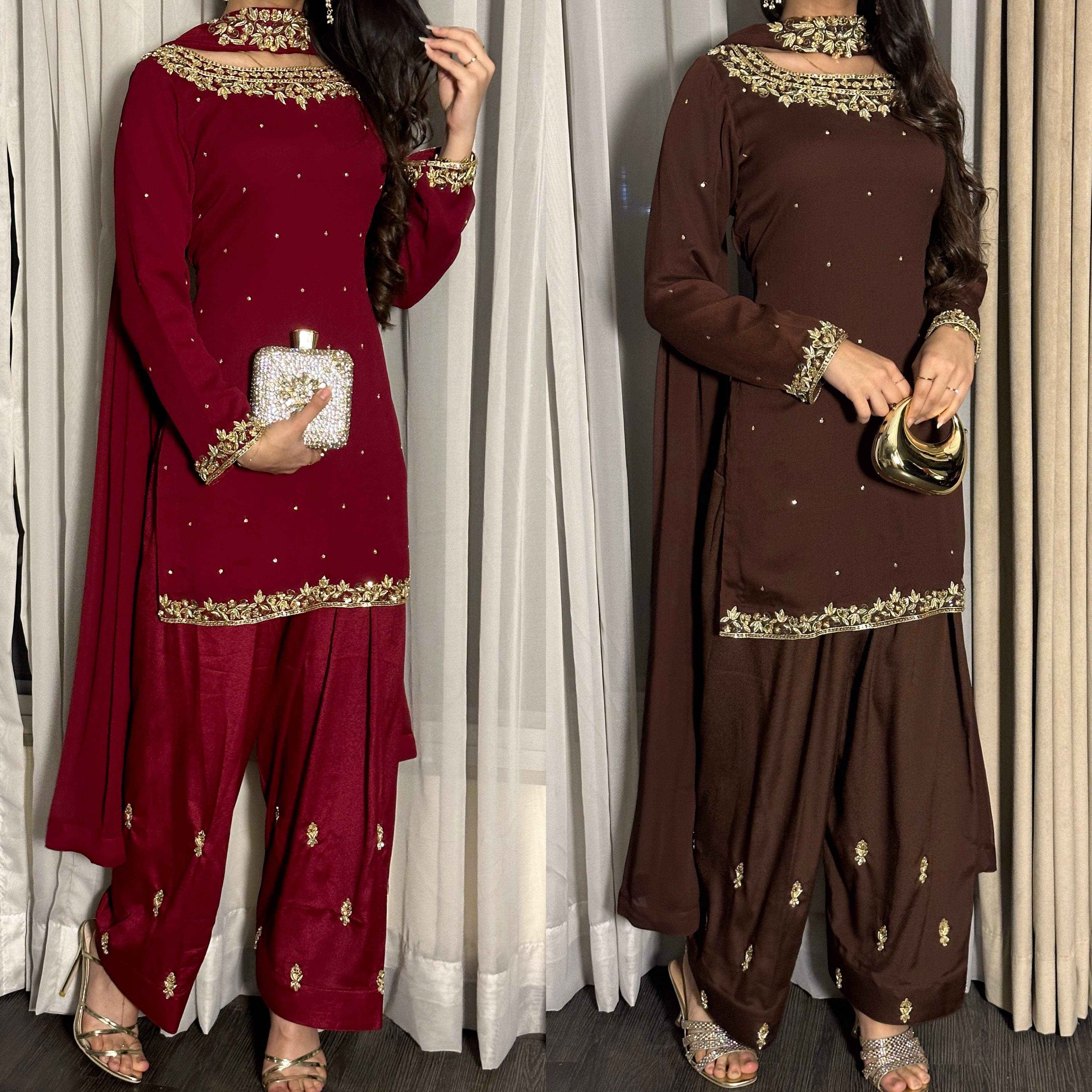 HUMNA Cocoa - 3 Piece Chiffon Suit with Farshi Shalwar