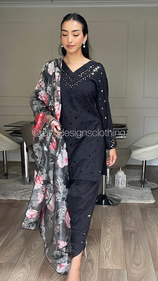 LEENA Black - 3 Piece Chikankari Suit with Tulip Shalwar
