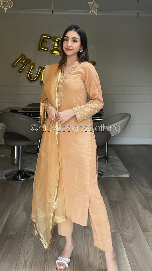 • SUNDAS - 3 Piece Korean Raw Silk Suit with Jamawar Dupatta (8034487730389)