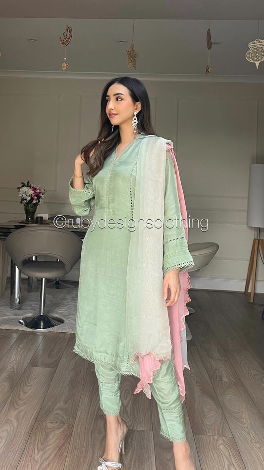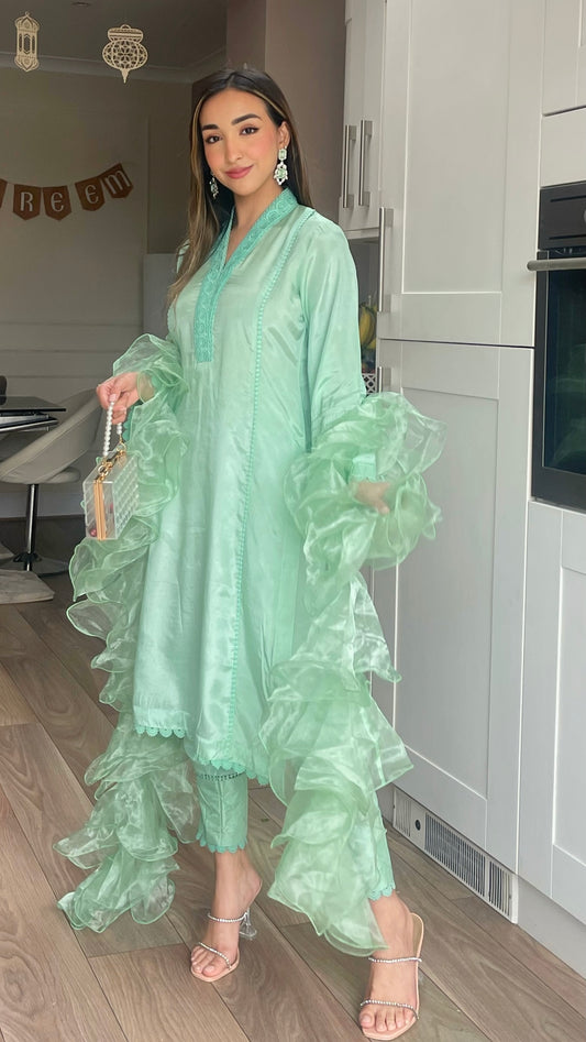 • JAISHA - Mint Green 4 Piece Cotton Silk Suit with Organza Ruffle Dupatta (7675157577941) (8747932418261)