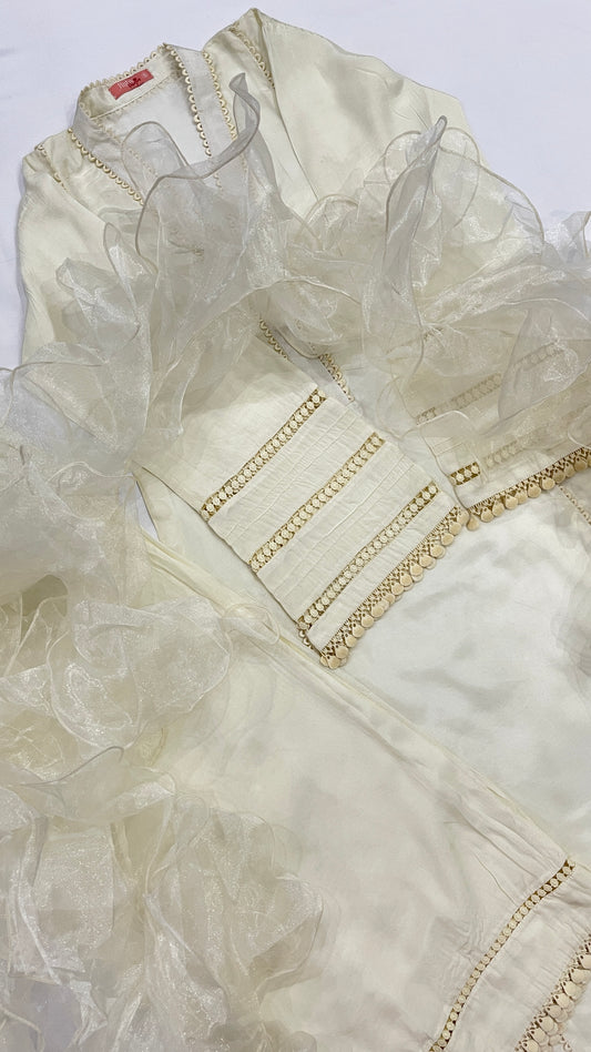 AYLA White - 3 Piece Off-White Cotton Silk Suit with Ruffle Organza Dupatta