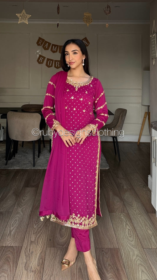 ZAREEN Fuchsia - Luxury 3 Piece Chiffon Suit with Gold Handwork