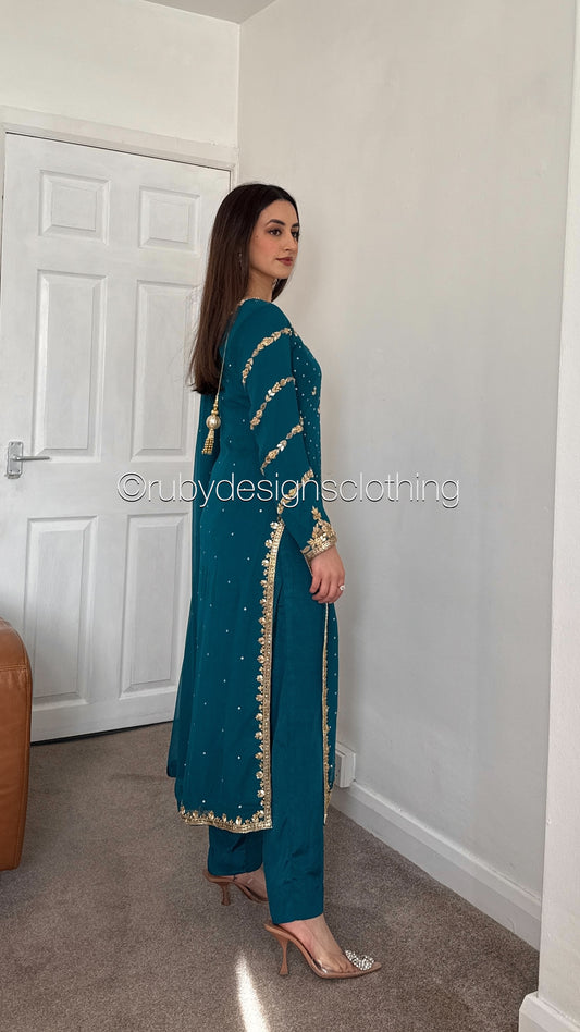 ZAREEN Teal - Luxury 3 Piece Chiffon Suit with Gold Handwork