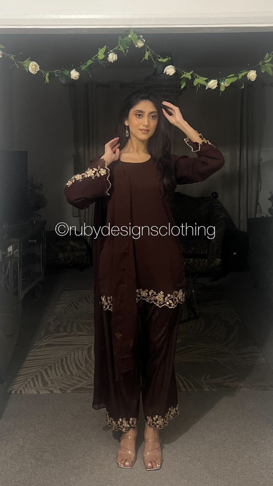 SAMAN Cocoa - 3 Piece Chiffon Suit with Embroidered Detailing