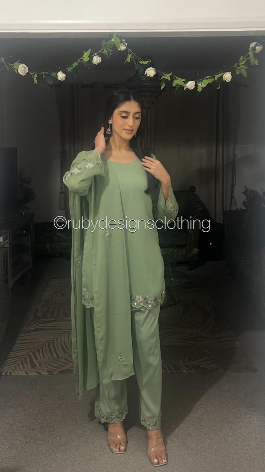 SAMAN Sage - 3 Piece Chiffon Suit with Embroidered Detailing