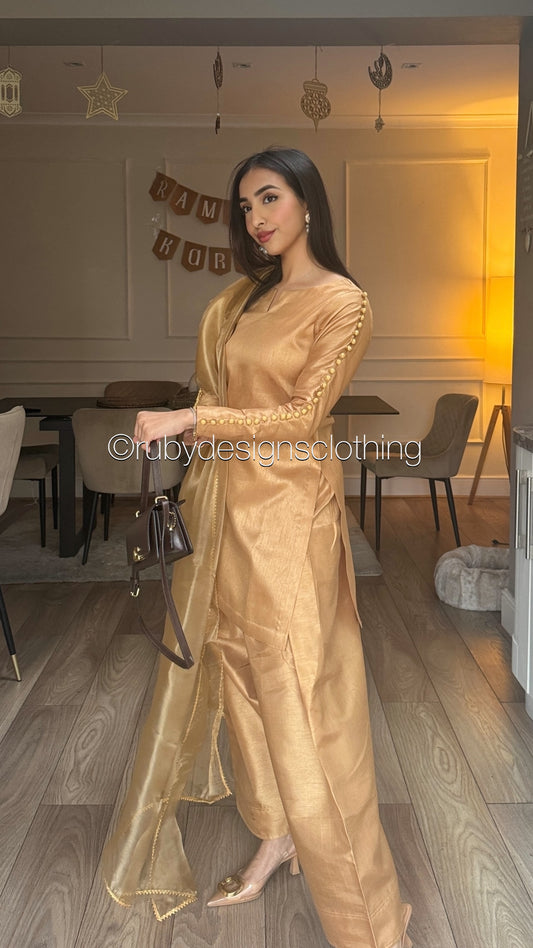 ZIMAL Gold - 3 Piece Korean Raw Silk Suit with Farshi Shalwar