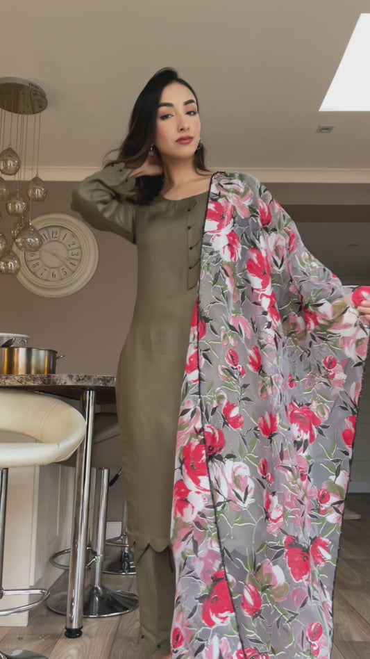 ALISHBA - 3 Piece Khaki Marina Suit with Floral Print Organza DupattaRegular price R$ 289,00 BRLRegular priceUnit price / per-