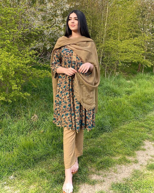 HIBAH - 3 Piece Brown Linen Suit with Printed Organza DupattaRegular price R$ 324,00 BRLRegular priceUnit price / per-