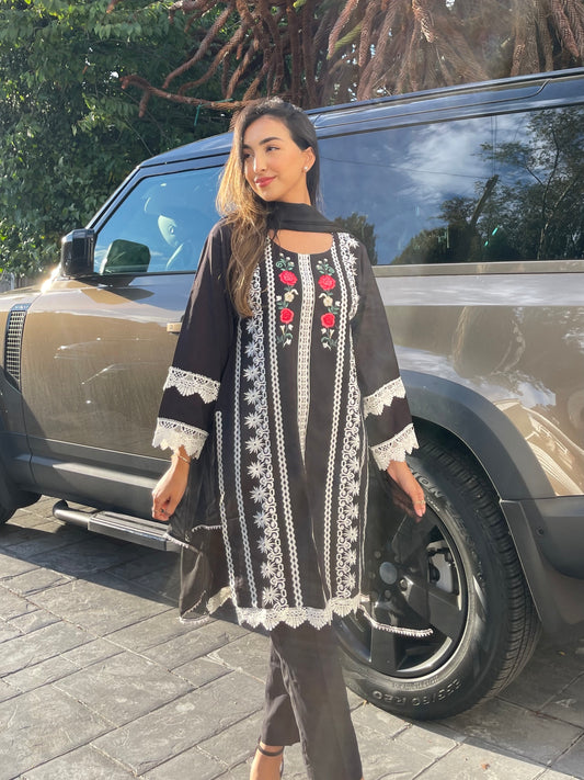 TAHERA - 3 Piece Black Linen Suit with White Lace and EmbroideryRegular price R$ 252,00 BRLRegular priceUnit price / per-