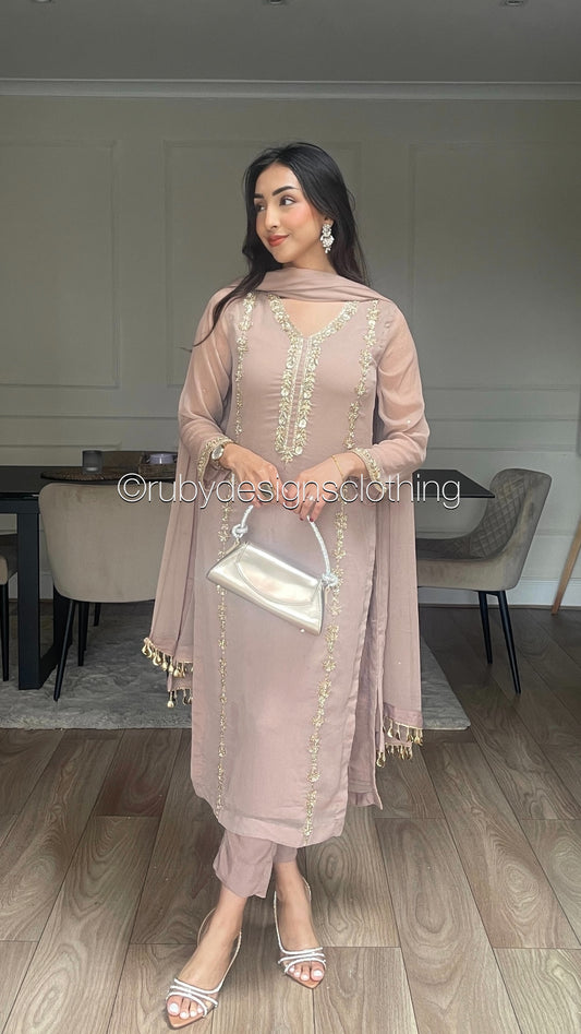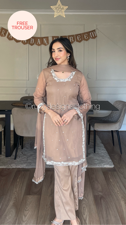 • AYRA Dawn - 3 Piece Brown Chiffon Suit with Farshi Shalwar