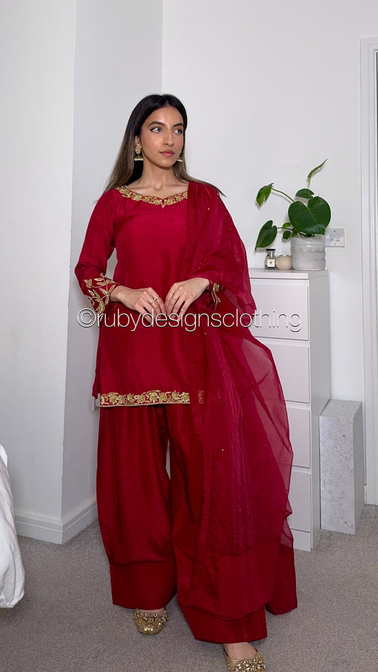SHAFAQ Ruby - 3 Piece Raw Silk Suit with Farshi Shalwar