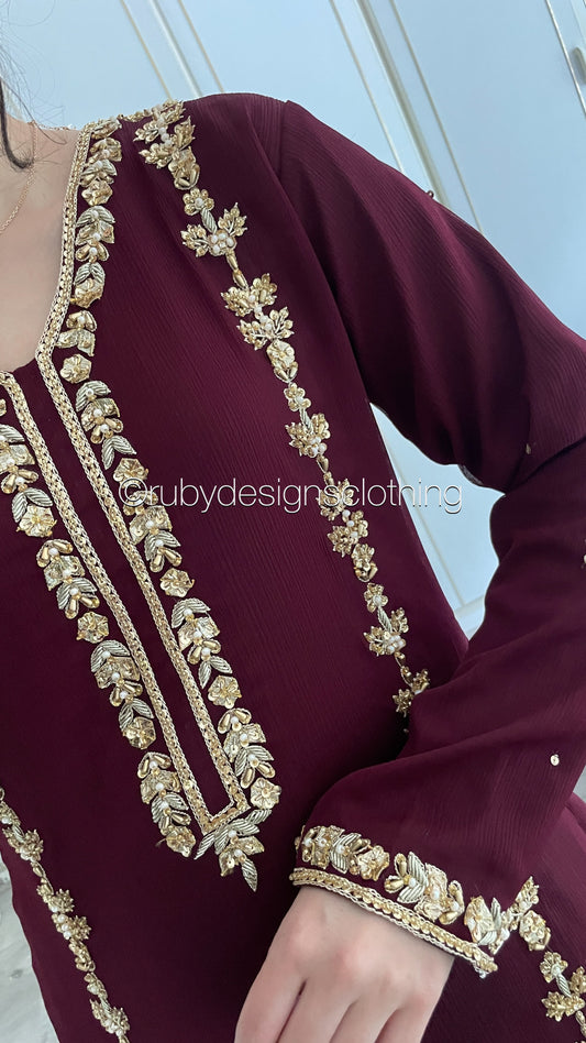 SADAF Burgundy - 3 Piece Burgundy Chiffon Suit with Gota Work
