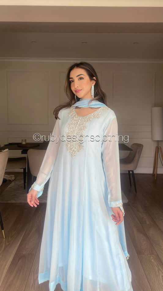 FALAK - 3 Piece Ice Blue Chiffon Dress with Chiffon Dupatta