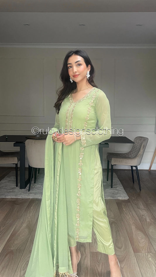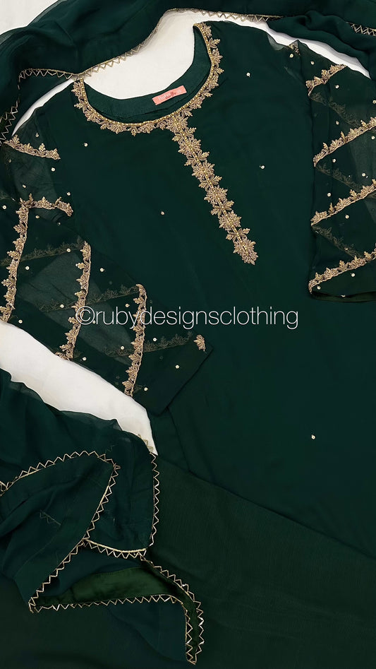 IRHA Emerald - 3 Piece Chiffon Suit with Gold Handwork