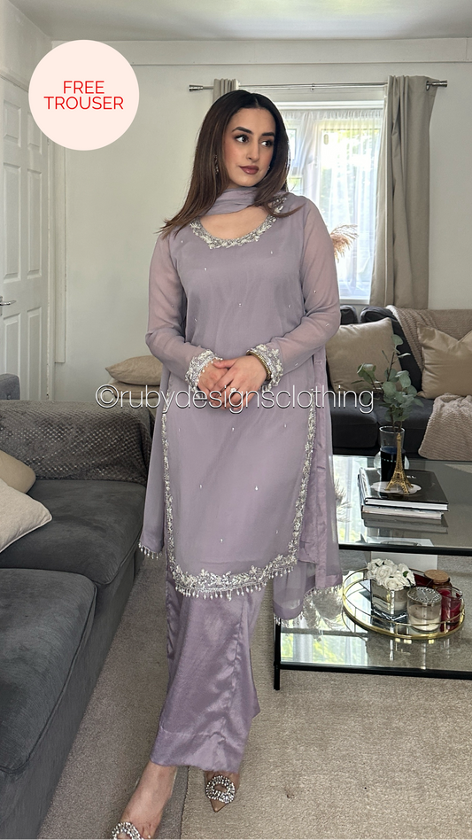 • AYRA Dusk - 3 Piece Muted Lilac Chiffon Suit with Farshi Shalwar