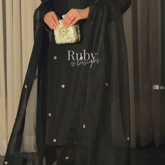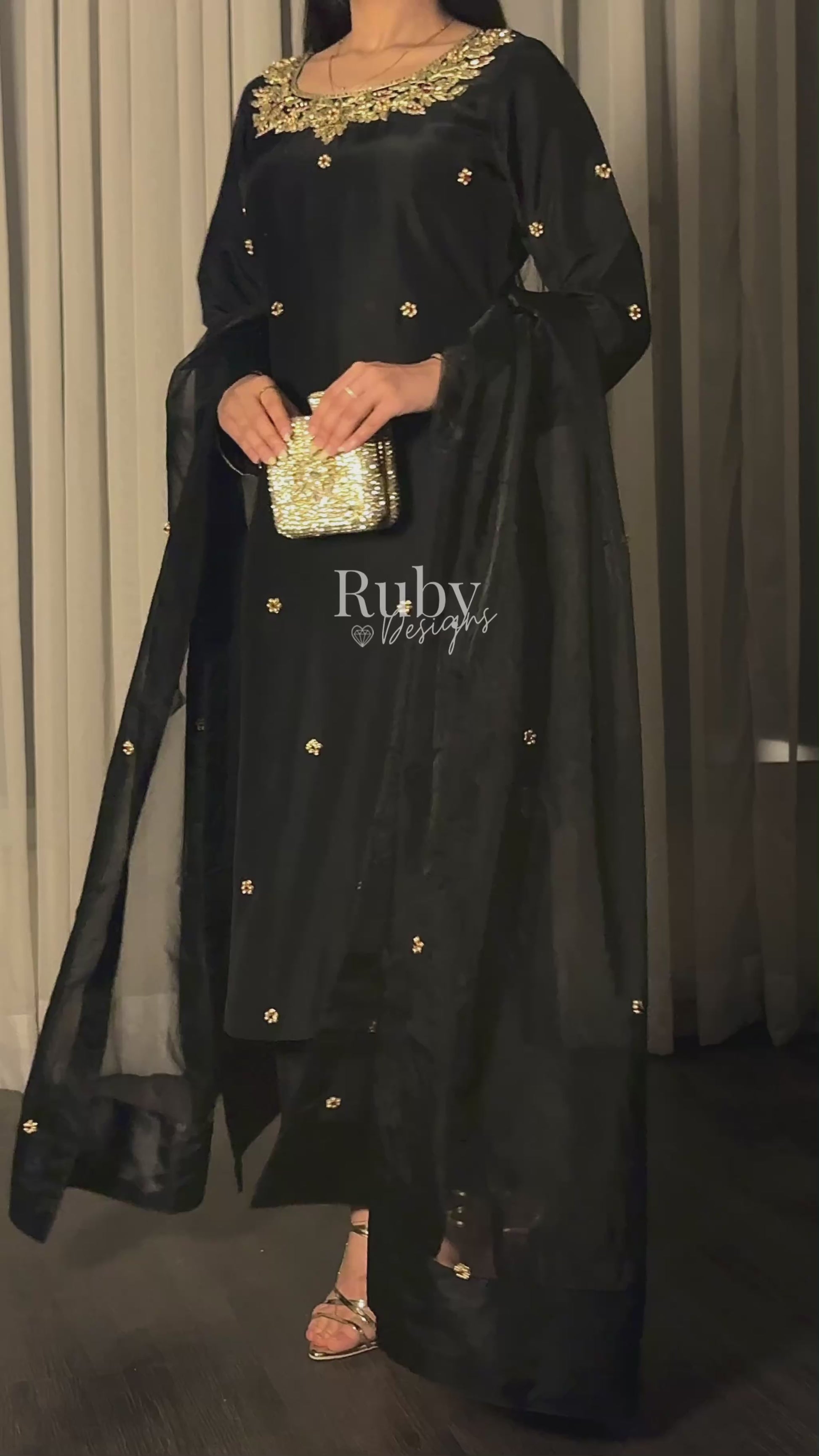 MEHRA is a timeless black & gold 3-piece, crafted in silk and finished with a delicate gold handwork with hints of deep red throughout. Designed with a long, elongating silhouette that flatters effortlessly, featuring clean side slits with handmade tassels for a subtle statement. Paired with a pure organza dupatta with floral motifs, adding a polished, elevated finish to the overall look. Pair with some gold jewellery, and wear her for years to come ✨