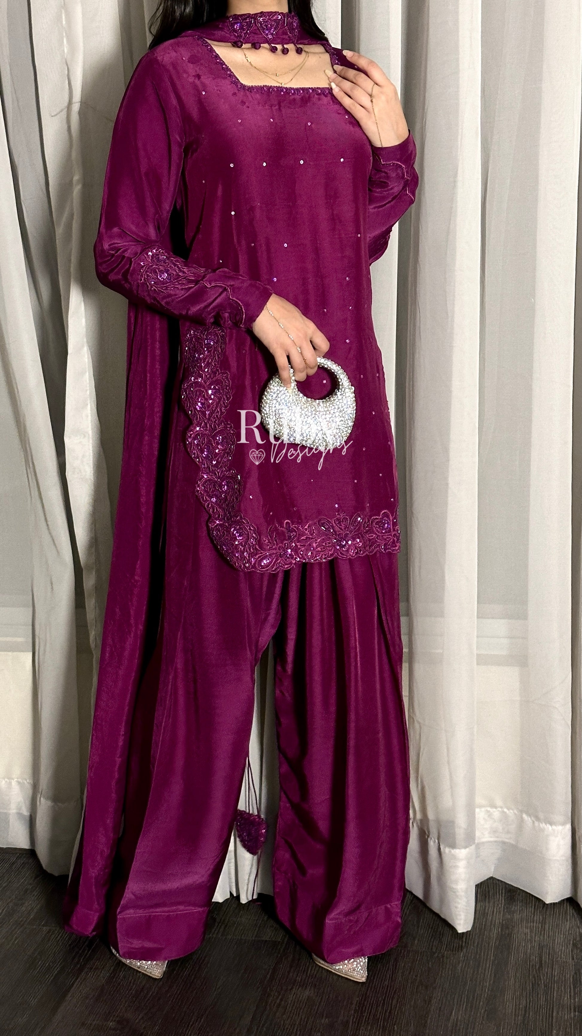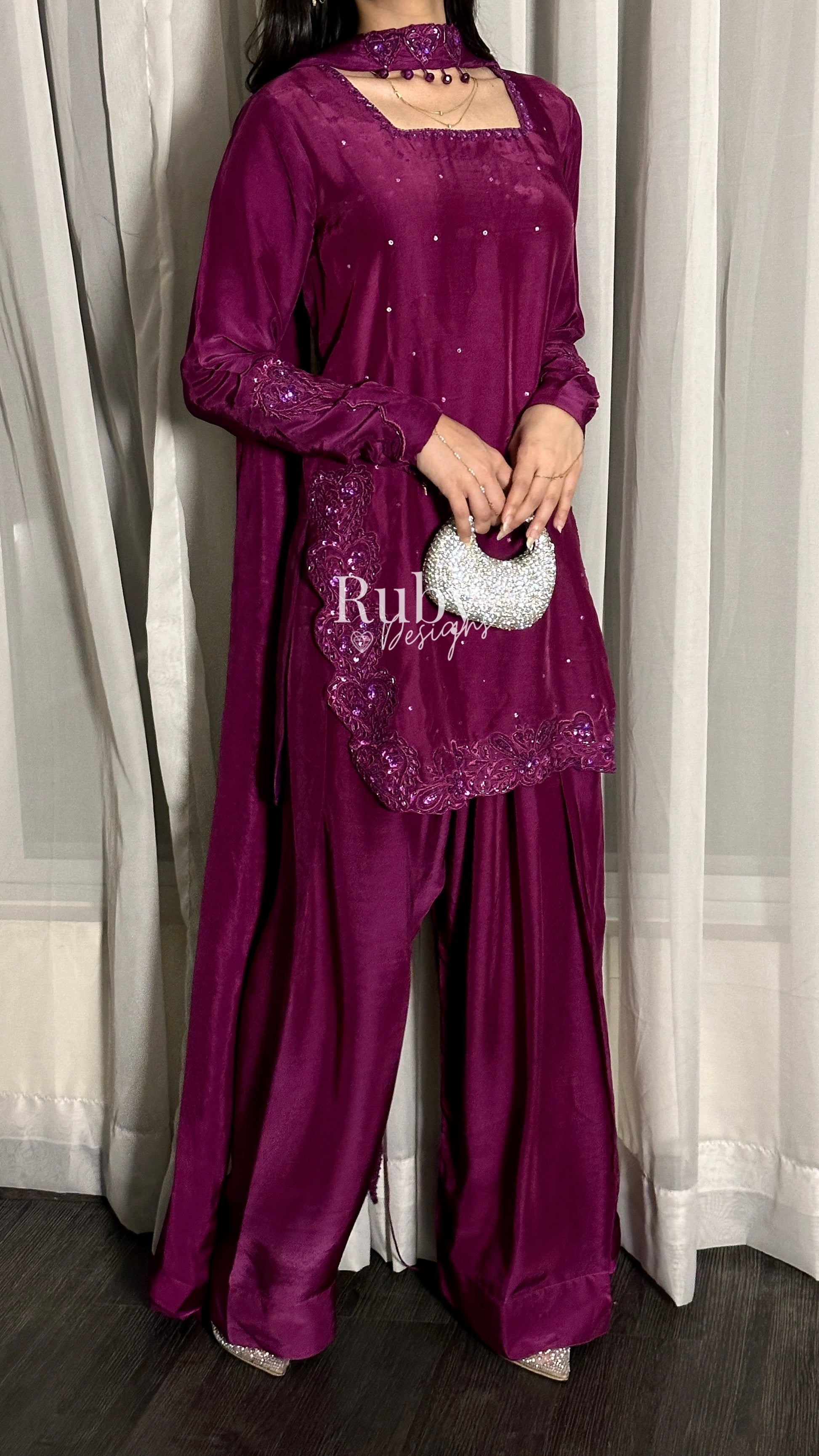 RAISA Cherry - 3 Piece Luxury Velvet Suit with Heavy Embellished Shawl