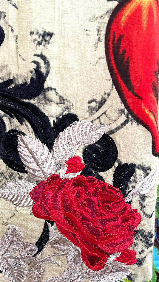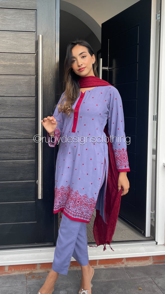 AMINAH - 3 Piece Blue Linen Suit with Maroon Embroidery and Shawl