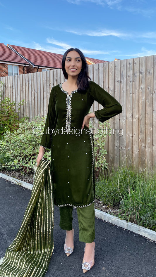 AMARA - 3 Piece Dark Green Velvet Suit with Organza Dupatta