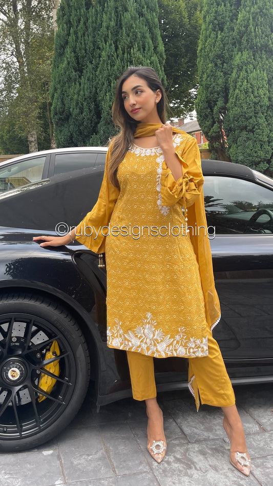 SHIZA Mustard - 3 Piece Linen Suit with Chiffon Dupatta