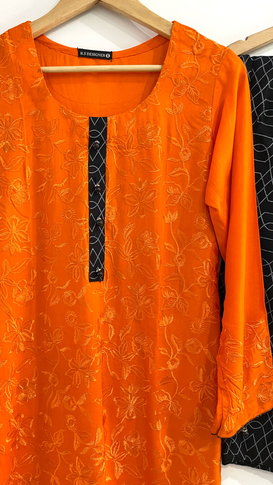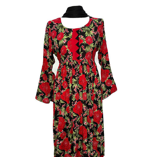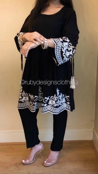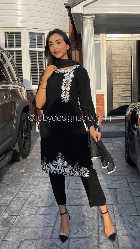 SHARIYA Black - 3 Piece Dress with White Embroidery and Flared Sleeves