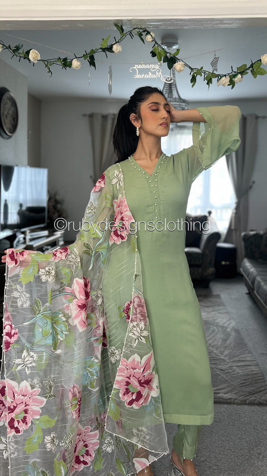 ARIA Sage - 3 Piece Sage Green Chiffon Suit with Chiffon Dupatta