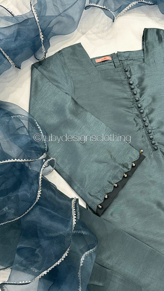 ALEEZA Blue - 3 Piece Raw Silk Suit with Ruffle Dupatta