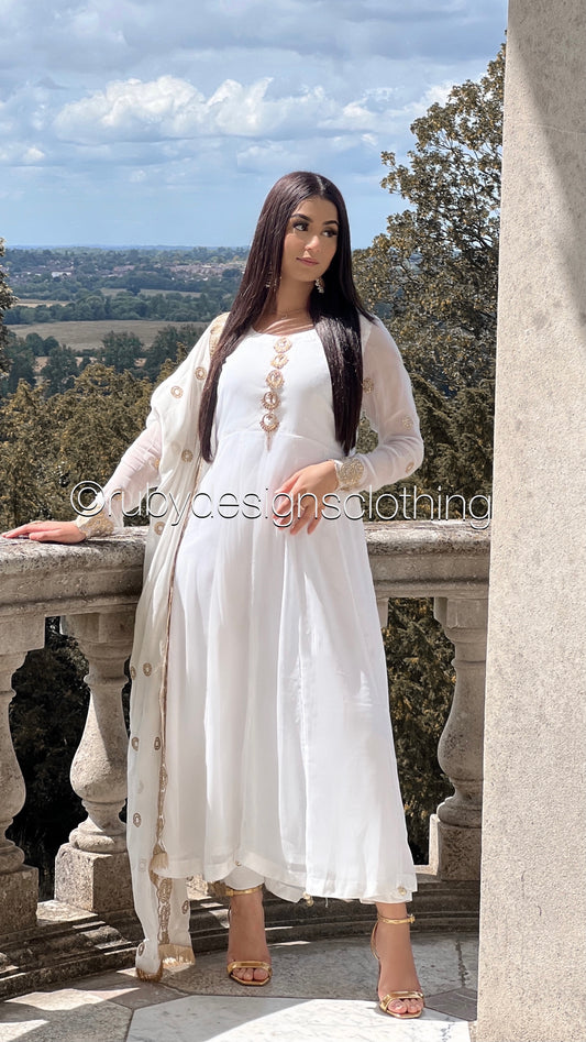 MAYA - 3 Piece White Anarkali Suit with Sequin Work Chiffon Dupatta