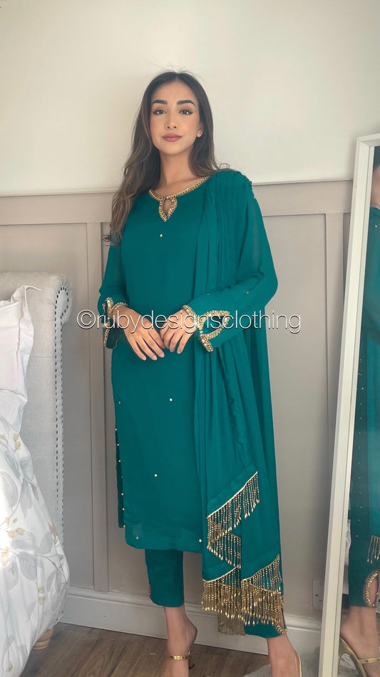 LIMITED EDITION HAYA Deep Sea Green - 3 Piece Chiffon Suit with Hand Embellished Neckline