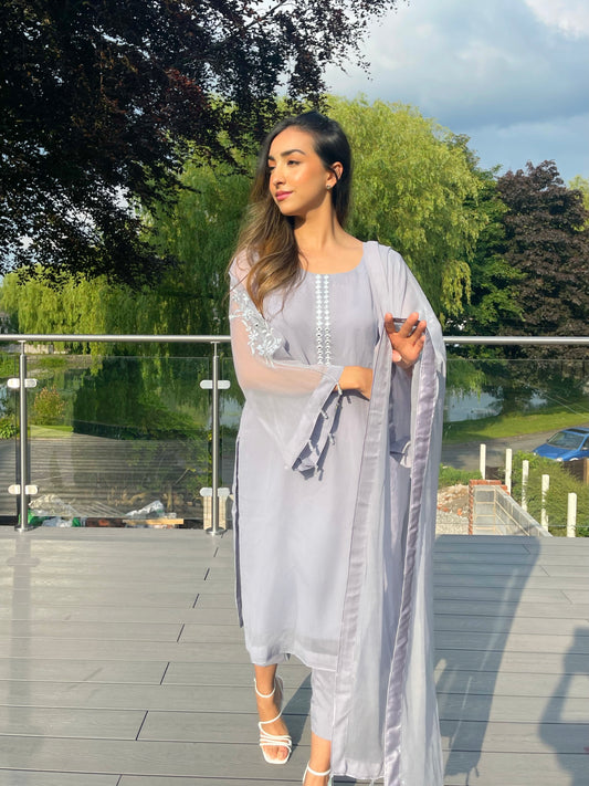 AMANI - 3 Piece Grey Chiffon Suit with Mirror and Tassel Details