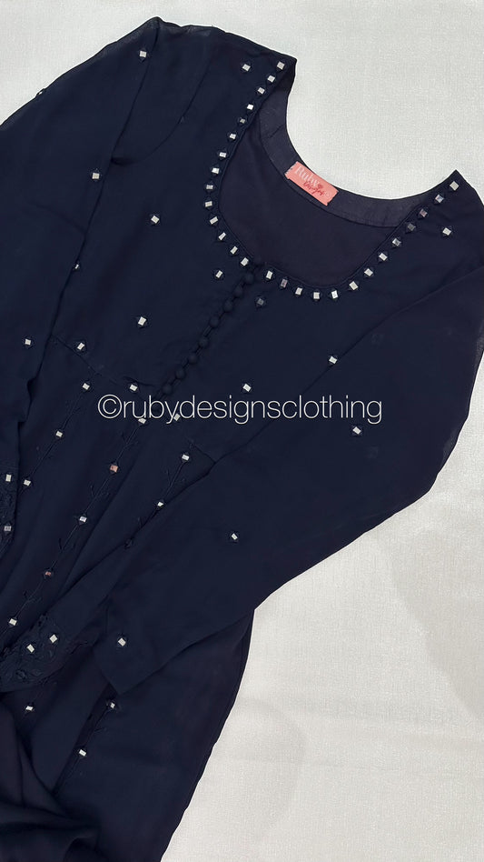 INAARA Navy - 4 Piece Chiffon Dress with Matching Bag
