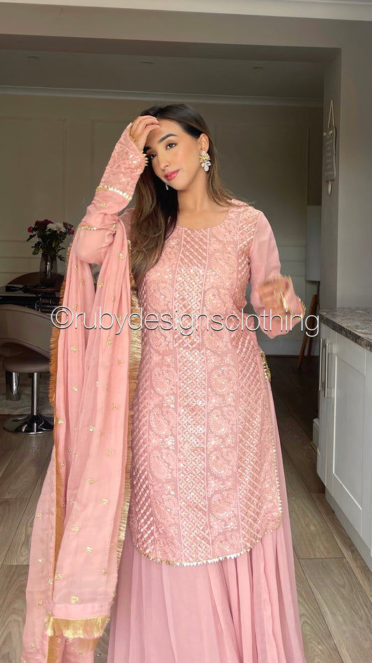 LANA - Blush Pink Luxury 3 Piece Chikankari Chiffon Sharara Suit with Pure Chiffon Dupatta