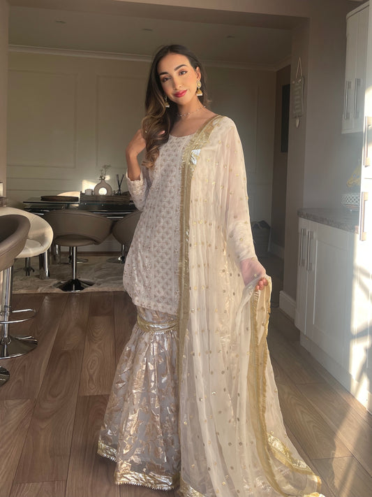 YASMIN - 3 Piece Luxury Off-White and Gold Chikankari Chiffon Suit with Gharara