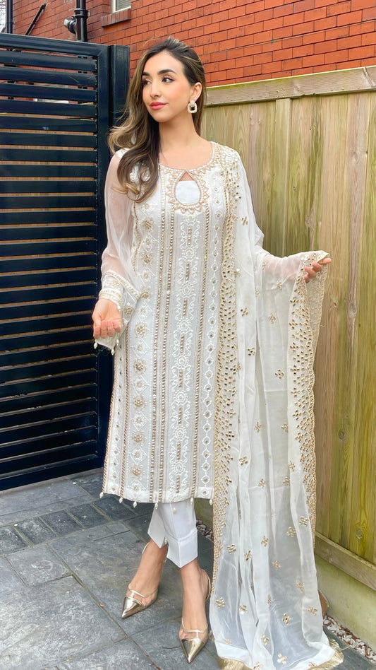 SABINA - Off-White and Gold Luxury 3 Piece Chikankari Chiffon Suit with Pure Chiffon Dupatta
