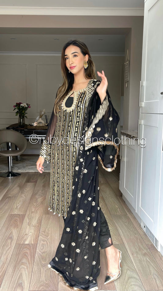 MAHAM - Black and Gold Luxury 3 Piece Chikankari Chiffon Trouser Suit with Pure Chiffon Dupatta