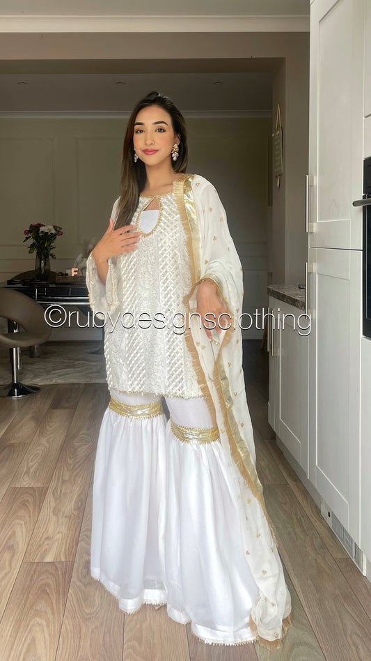 SYRA - White and Gold Luxury 3 Piece Chikankari Chiffon Gharara Suit with Pure Chiffon Dupatta