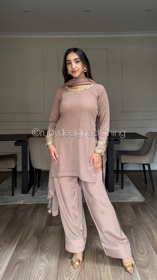 RAHA Latte - Luxury 3 Piece Chiffon Suit with Farshi Shalwar