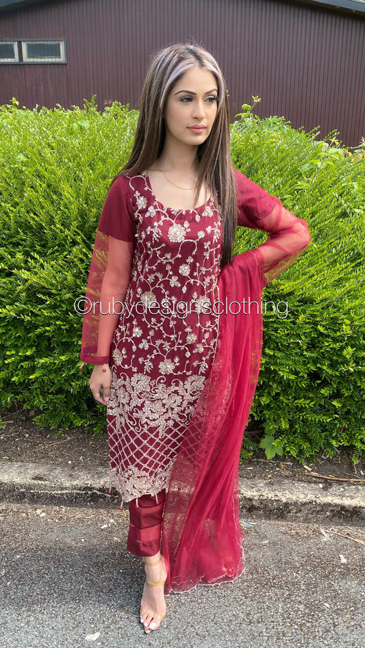 Missing Item (No Trouser) - ALARA - 2 Piece Maroon Net Suit with Gold Embroidery