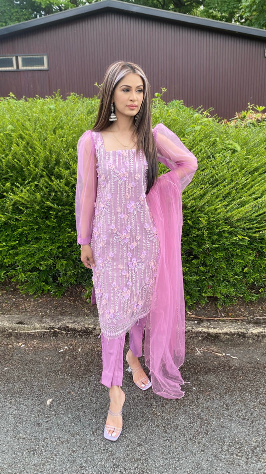 AMAL - Pink 3 Piece Heavy Embroidered Net Suit with 3D Detail