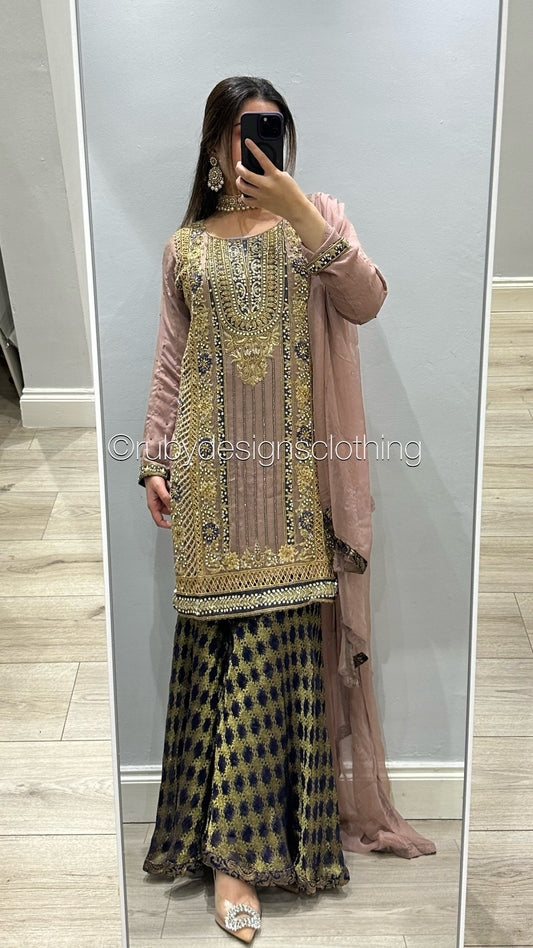 EXCLUSIVE SAMPLE - 3 Piece Heavy Embroidered Chiffon Suit with Jamawar Sharara