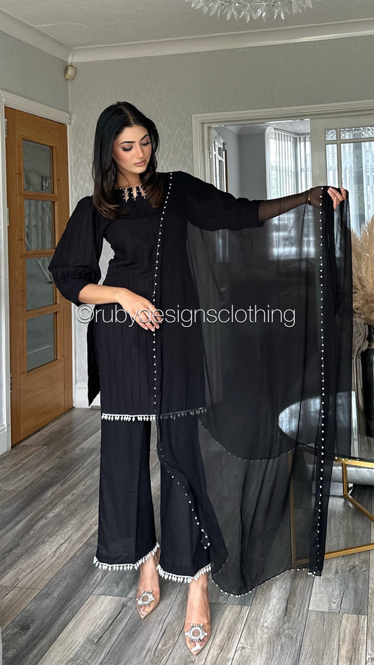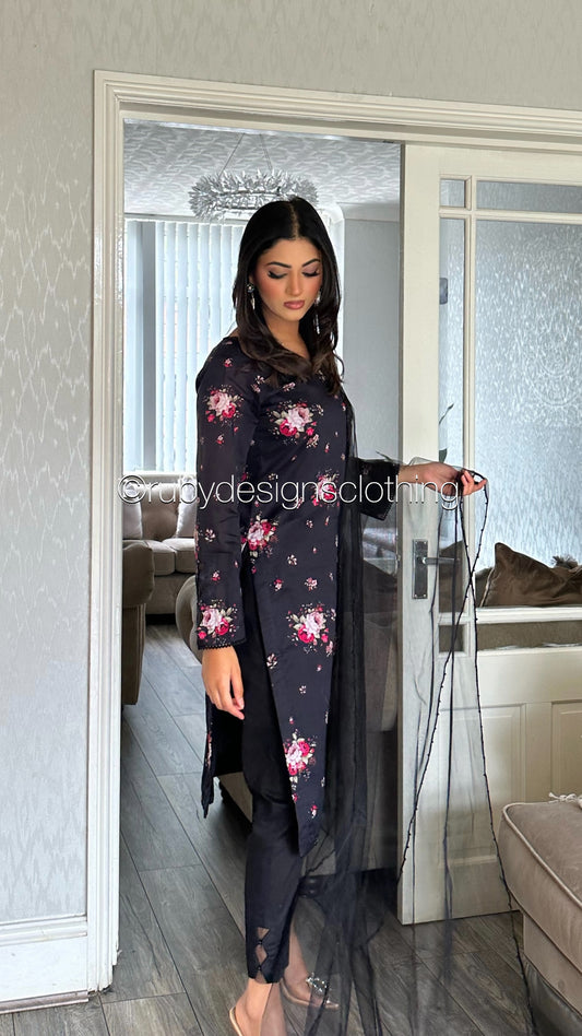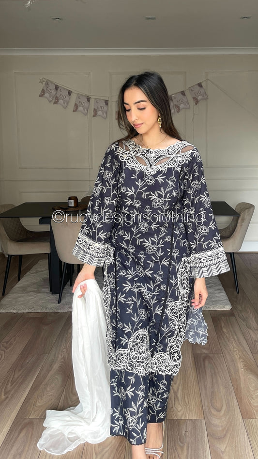 YARA - 3 Piece Black Cotton Suit with Chiffon Dupatta