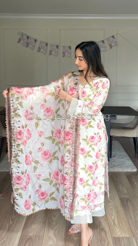 YUSRA - 3 Piece Cream Floral Print Swiss Lawn Suit with Organza Dupatta