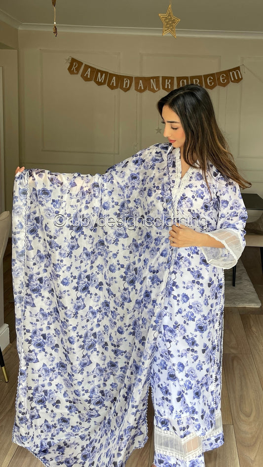 SUMAIYA- 3 Piece White and Blue Swiss Lawn Suit with Silk Dupatta