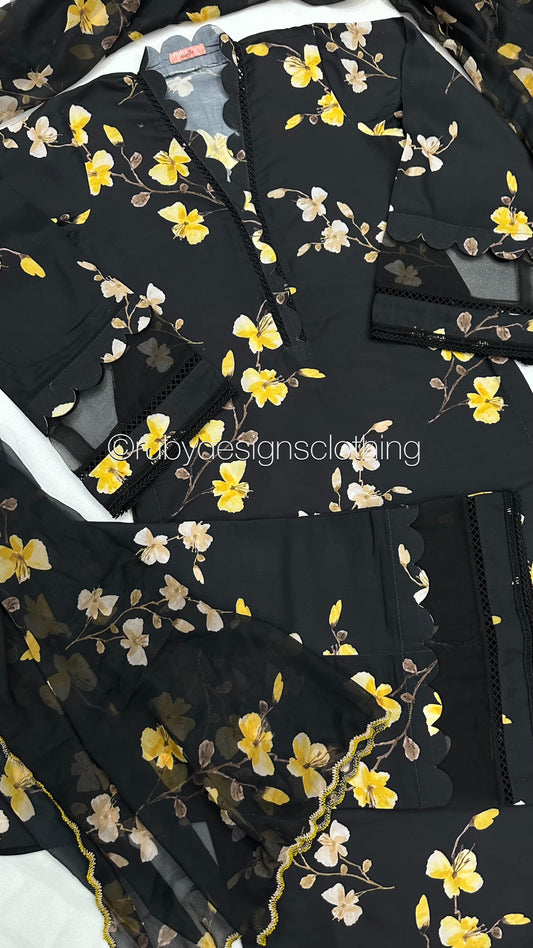 UMAIZA- 3 Piece Black and Yellow Swiss Lawn Suit with Silk Dupatta