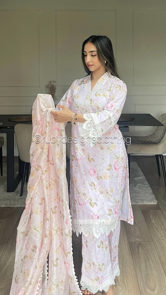 HIBA - 3 Piece Baby Pink Swiss Lawn Suit with Silk Dupatta