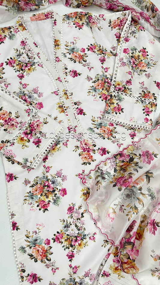 HALA - 3 Piece White Floral Print Swiss Lawn Suit