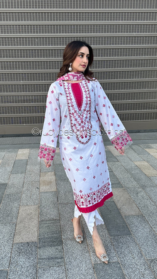 LATIFA - 3 Piece White and Pink Lawn Suit with Silk Dupatta